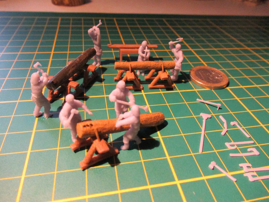 Carpenters at work, 7x poses; logs, log supports and worktable included.