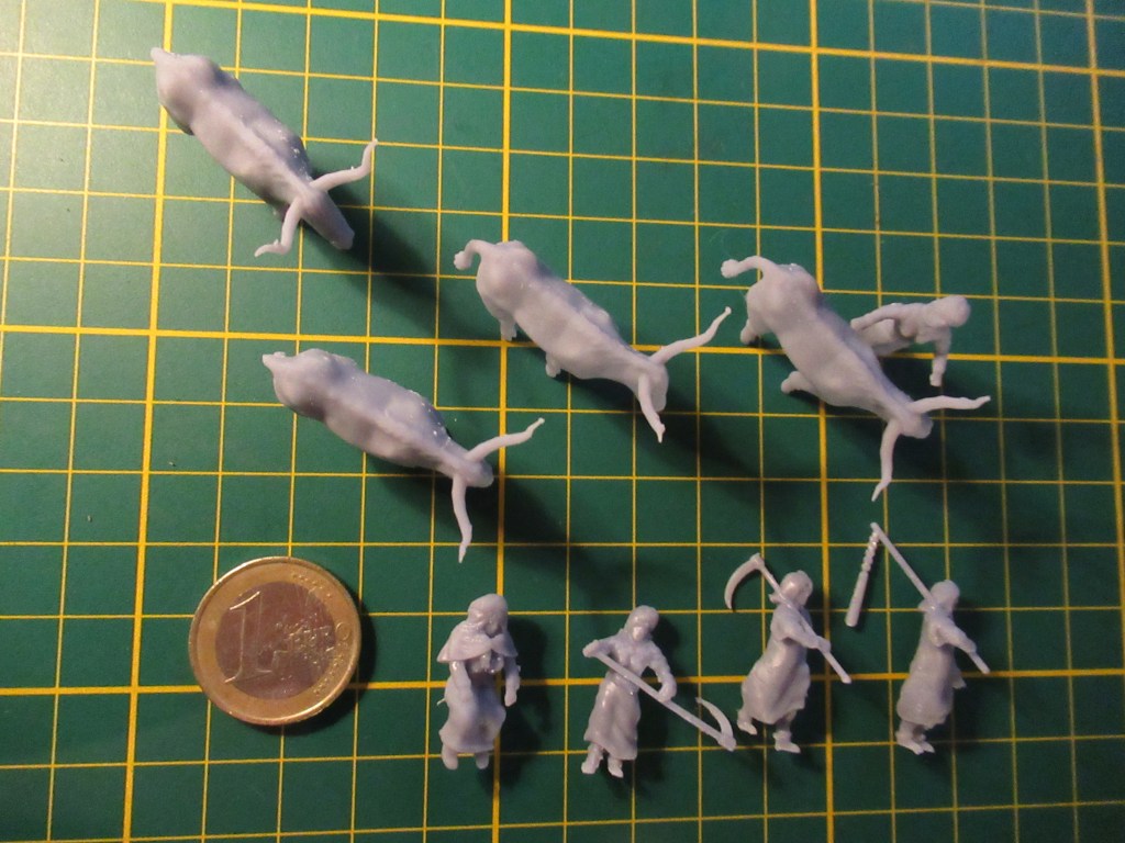 Male farmers with sickles and pitchforks, 6x poses; 4x oxen and wagon included.