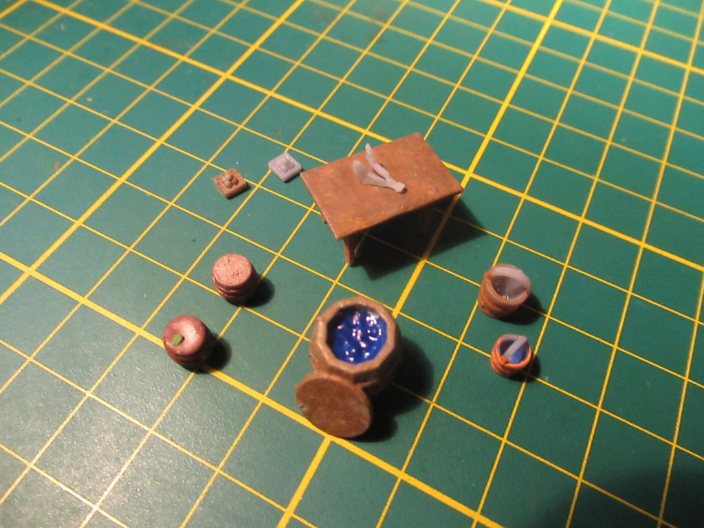 Odds and Ends: One accumulates many 3D printable odds and ends with time – barrels open and closed, cannon ball racks, tables, buckets, lanterns, even a horses’ lower jaw for a horse cult diorama. All equipment such as carpentry hammers, farming sickles and dragon heads for ships’ prows is also included here.